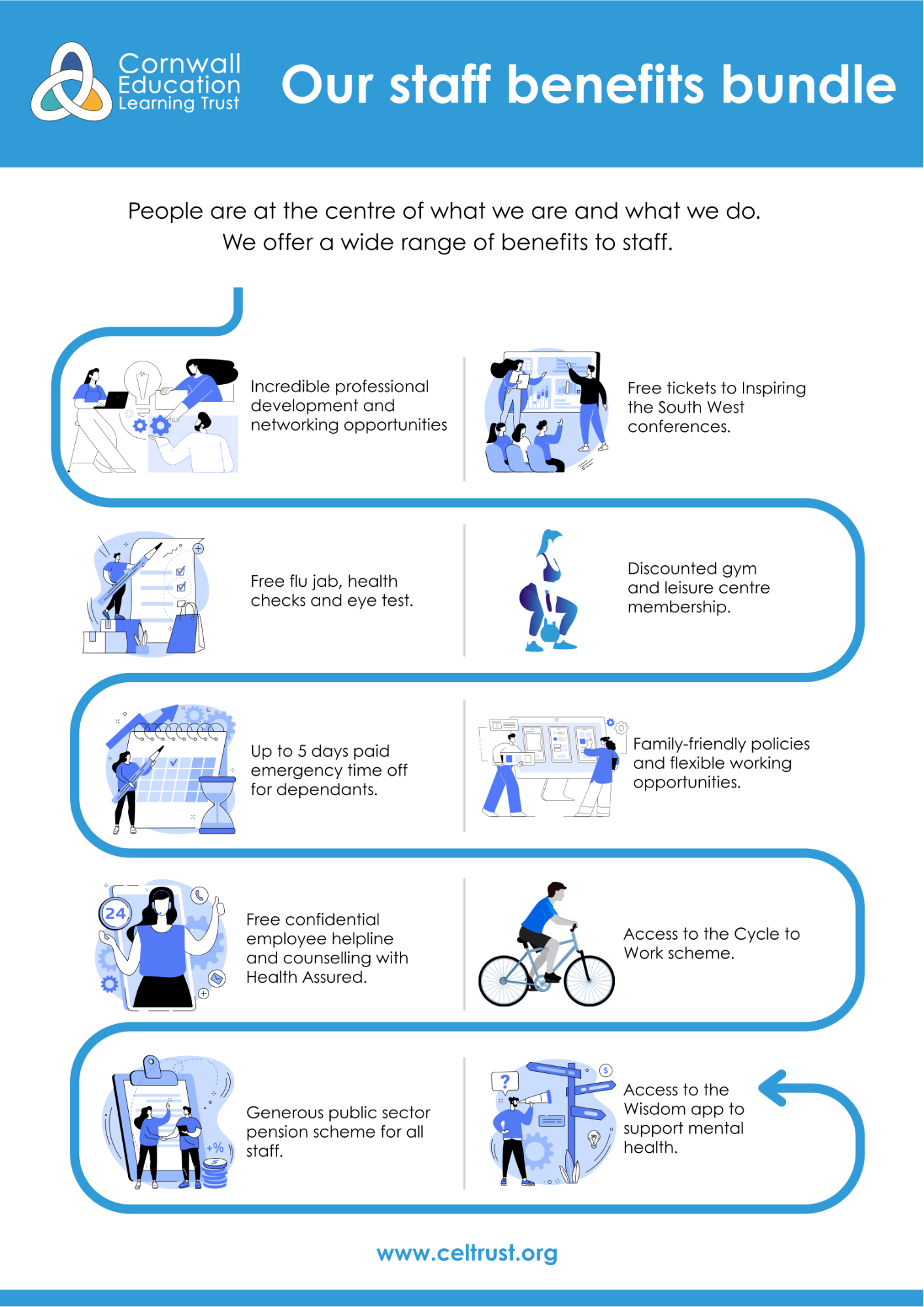 At Cornwall Education Learning Trust, we are committed to providing a healthy working environment and improving the quality of working lives for all staff. We aim to ensure that our values are embedded in everything we do as a Trust and that staff are recognised as our greatest asset.